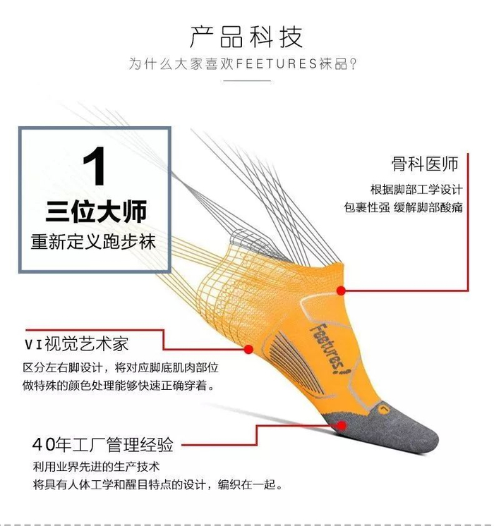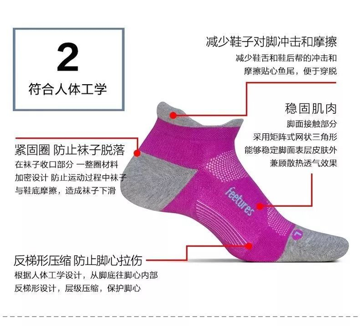 FEETURES: 跑步的袜子,太紧,有明显勒痕影响血液循环;太松的话,额外的纤维会加重摩擦损伤脚部皮肤(磨脚),FEETURES 根据人体工学设计,从脚底往脚心内部反梯形设计,层级压缩,防止脚心拉伤。