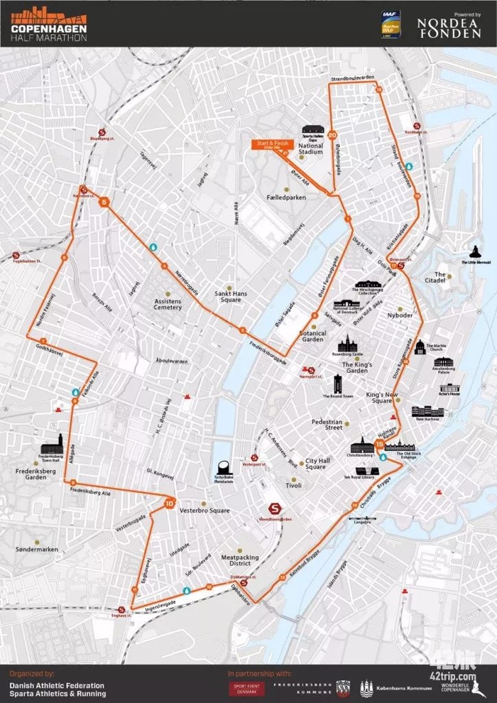 选手们从体育场出发,随后,奔跑路线途经国家美术馆,哥本哈根植物园,著名的Kartoffelrækkerne联排公寓、丹麦著名艺术家安徒生的墓碑、以绿色著称的腓特烈堡(Frederiksborg Castle)花园、克里斯蒂安堡宫(Christiansborg Slot)、大理石教堂(Marble Church)等经典建筑。21公里的路程绝不会漫长,而是一幅哥本哈根多元文化历史的缩写。