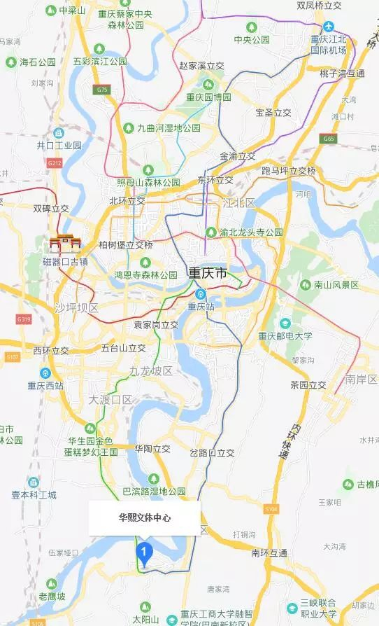 百度地图搜索比赛场馆,距离重庆市中心较远,不过交通还算便利,紧邻2、3号轻轨线鱼洞站。据称,场馆周边配有2000+停车位。