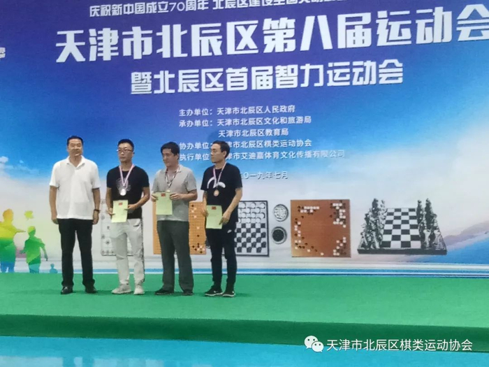 2019年7月7日,由天津市北辰区人民政府主办、天津市北辰区文化和旅游局、天津市北辰区教育局承办、天津北辰区棋类运动协会协办的天津市北辰区第八届运动会暨首届智力运动会在天津市北辰区万源龙顺度假庄园圆满落幕。天津市棋牌运动管理中心主任王征、天津市北辰区文化和旅游局书记郭建新、天津市北辰区文化和旅游局调研员魏金春、天津市北辰区教育局副局长刘福颖、天津市国际象棋协会秘书长王悦民等领导出席了闭幕式并为获奖选手颁奖。