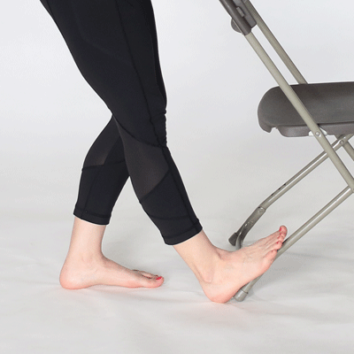动作2 站立伸展步骤1:站在一张折叠椅子后面,用一脚踩住椅子的脚背。