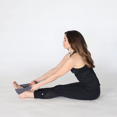动作4 毛巾伸展步骤1:坐在地板上,双腿打直。