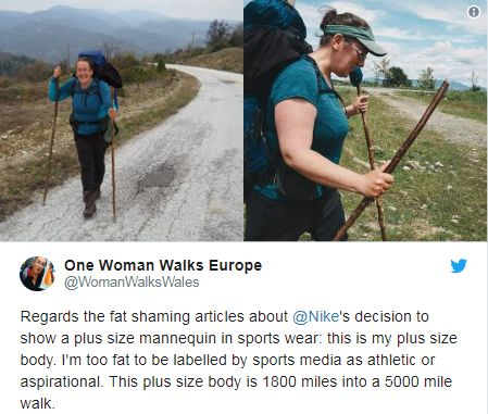 “无论从哪个角度看,这个模特都是非常肥胖的,就算穿着崭新的耐克运动装备,她看上去也不像是准备好了下地跑两步。她更像是一个糖尿病前期患者,正准备去做髋关节置换手术。”