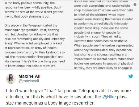 而一位身体形象研究师@maxineali更是贴出了一份研究报告,来声援Nike的这一行为:目前市面上90%以上的女性人形模特都处于一个医学上非常不健康的状态,她们的体脂率远远低于正常水平,如果换做一个真人的话,这样的体型很容易造成停经。“为什么没见人抱怨这些?”
