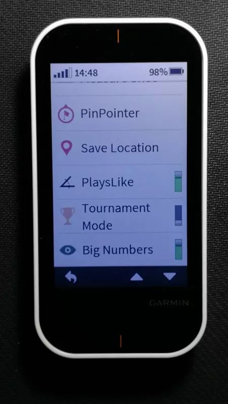 G80采用的是佳明自己开发的系统,而非安卓。从底层操作逻辑来说,这套系统很容易上手。操作时算不上特别顺滑,但反应速度比较快。它的图标也不够炫,但是非常直观易懂。在屏幕最上方,分别是5个格的GPS信号强度、时间(G80可以根据所在时区自行调整)、百分比电量和电量图标,这点和手机非常像。而虚拟的菜单键、返回键主要出现在左下角。关于产品的使用方法和功能中涉及的名词,在相应的菜单中会以Tips和名词解释的方式出现,即使你是初次使用这类产品也不会有任何疑惑。比如,它会告诉你测距时的主机的摆放方法,也会告诉你什么叫Smash。