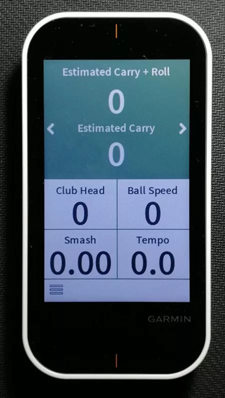 G80的第二个功能选项是“WarmUp(热身)”,它的适用地点是练习场。进入界面后雷达会自动开启,而按一下机身右侧的雷达快捷键就可以退出。这个功能选项可以监测击球的距离、杆头速度、球速、效果转换率(Smash,即球速除以杆头速度)和挥杆节奏。因为球的滚动距离会受到球本身、场地、天气等各种环境影响,所以滚动距离需要在菜单中设置。