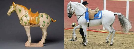 中长型的耳朵极富表情且灵活;眼睛大而灵活呈三角形,眉骨突出但不超过额鼻所形成的平面,杏仁状鼻孔不凸出;下颌部饱满、少肉,长而呈适度弓形的下颌缘线。肩长而富于肌肉,倾斜而富有弹性;上臂强壮且角度好;前臂有力,中等长度;前膝发育良好,轮廓清晰;管部长度比例适合,外形良好,筋腱充足;球节轮廓清楚、明显,距毛稀少;系部外形、角度、方向良好;蹄强壮,大小适当,发育良好。股部肌肉丰满,臀部略弓,富于肌肉;飞节强壮、宽且清楚;趾关节以下同前肢;腿长,肢势正常。这些特征都与唐三彩马的形象相符,而唐三彩马应是唐时马匹的真实写照,再有留存至今的唐时马匹绘画中马的形象无一不是丰盈健硕。由此唐马与安达卢西亚马之间应是存在必然关系的。