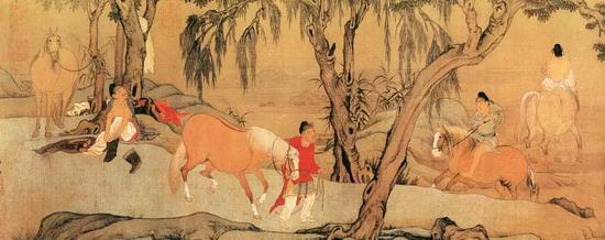 唐人与宋人的妾一般都是指色艺俱佳女子,是古时文人生活中非常重要的“必需品 ”。而马的重要性则超过妾,马已不再是单纯的家畜,而是心灵相通的精神伴侣。在唐代不是从主人的身份推测马的价值而是由马的气质估量主人的地位。在唐代鞍马绘画中,鞍马一般都不是处于点缀背景的位置,而是处于与主人同等重要的位置。