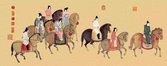 唐时女子骑马很普及,唐初时女人出门都戴一种长及脚面的面纱,将整个脸和身体都掩盖在面纱下面,很像现在穆斯林妇女的打扮但没多久此种装扮就不流行,开放的大唐女人喜欢戴一种可以露出脸的宽檐帽骑着马出门,连皇帝下诏都无法禁止,再过不久干脆就穿男装出门。武则天就曾当过宫廷女子马球队的队长,唐时妇女骑马之风很是盛行。《新唐书》车服志中:“初,妇人施以蔽身,永徽中,始用帷帽,施裙及颈,坐担以代车。命妇朝谒,则以驼驾车,数下诏禁而不止。武后时,帷帽益盛,中宗后,乃无复矣。宫人从驾皆胡帽乘马,海内效之,至露髻驰骋,而帷帽亦废,有衣男子衣而,如奚、契凡之服。” 《全唐诗》花蕊夫人《宫诗》有描述宫女初学骑马时的情景:“殿前宫女总纤腰,初学鞍骑怯又娇,上得马来才欲走,几回抛抱鞍桥。”