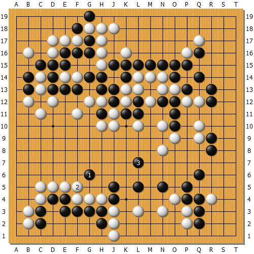 第一爪:黑1-5补棋,没毛病,但正是这几步棋让黑棋开始对白下面大块第死活想入非非,这几步可以说是黑棋“遁入魔道”的开端。