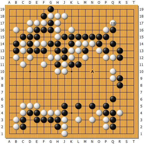 实战图2:回顾几十手之前,刘昌赫的白118扳角,是很冒风险的一手,此时白不如在A位飞更为简明,然而刘昌赫却另有打算。