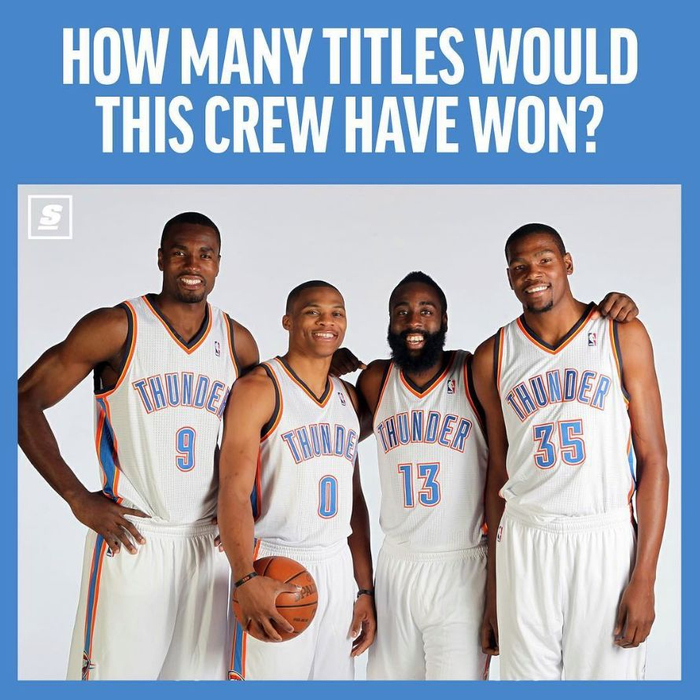 2012年,雷霆凭借着“雷霆三少”队史首次也是迄今为止唯一一次进入总决赛。可惜,因为当时三少都太稚嫩,杜兰特、威斯布鲁克和哈登分别只有24岁、24岁和23岁,他们总决赛遗憾地大比分1-4输给热火。即便如此,人们都认为这个组合假以时日不仅能带队夺冠,而且有望成为王朝组合。但那个夏天,雷霆队需要续约哈登和伊巴卡两人,哈登作为新科NBA最佳第六人,在索要5年8000万未果之后转而要求谋求一份4年6000万的合同,而伊巴卡则在想要一份5年6000万的合同未果后改求一份4年4800万的合同。