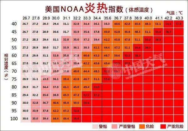 上文我们提到了温度,这里我们再来说一下湿度,准确地说应该叫“相对湿度”。相对湿度值会显示水蒸气的饱和度有多高。无论是在高温还是低温环境,相对湿度较大的天气都会让跑者觉得不舒服。从这张有关炎热指数的图中可以看出,在湿度越大的时候,人体的体感温度也会相应上升。