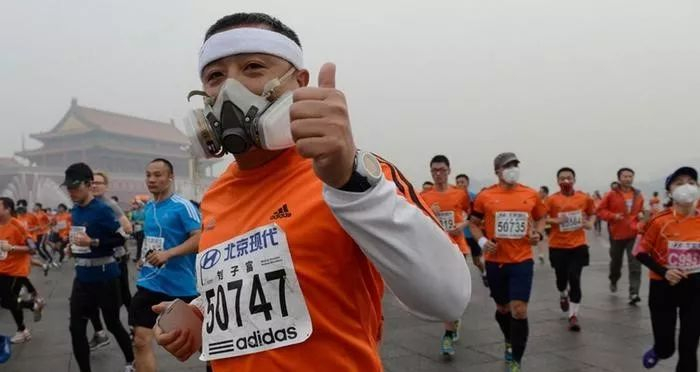 于是,赛道上就出现了许多跑者带着各种各样的面具、面罩、口罩奔跑,甚至还有的人带上了防毒面具。尽管如此,还是有很多人在比赛中途就放弃了,胸闷、气喘的情况时有发生。有的选手跑到终点,咳得痰还是黑的。