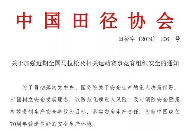 2019年5月25日,中国田径协会发布了《关于加强近期全国马拉松及相关运动赛事竞赛组织安全的通知》,表示“如遇雷暴、冰雹、极端高温、台风等需要取消比赛、终止比赛或延期比赛的情况,必须及时做好信息发布工作”。3天后的陕西宝鸡陈仓国际马拉松赛,就因地表温度达到72度,组委会决定终止比赛,这是国内马拉松首次因高温紧急中止比赛。