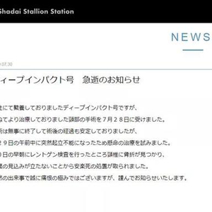 7月30日,曾7次获封“日本种王”的殿堂级种公马“大震撼”(Deep Impact)因颈伤不治被人道毁灭。