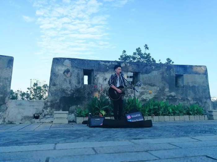 炮台的顶层,小哥哥弹唱着华语歌曲