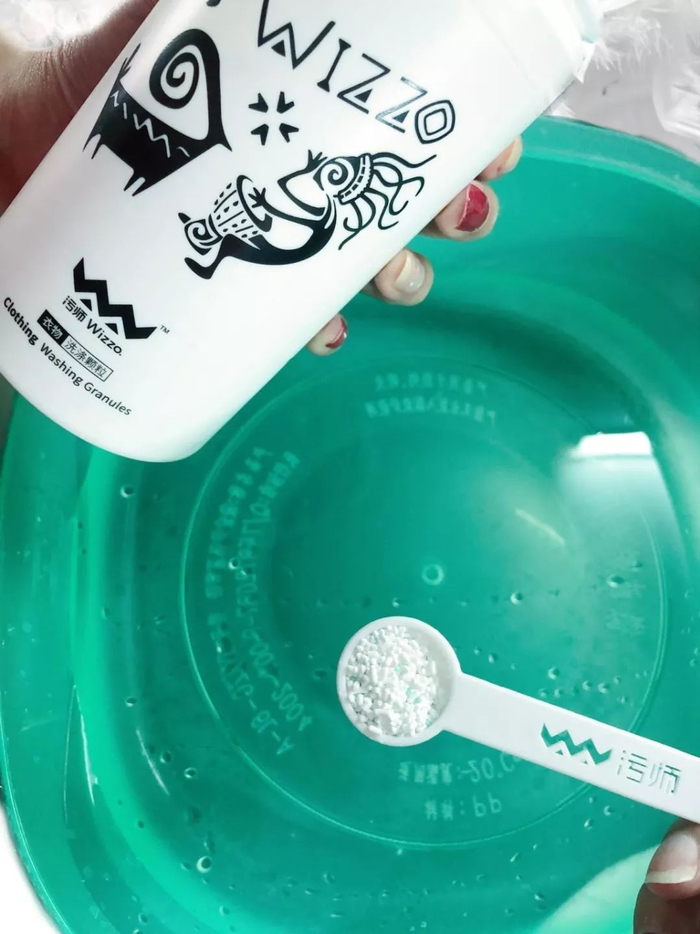 我的需求其实很简单,就是洗干净衣服,然后阴干的时候味儿少一点。拿到污师以后,根据说明,把一勺污师粉放入清水,然后把运动服一起放进去泡,然后就没再它了~大约过了半个多小时,就看到盆子里的水变了颜色,然后到了衣服上的几道陈年污渍也几乎肉眼不可见了!
