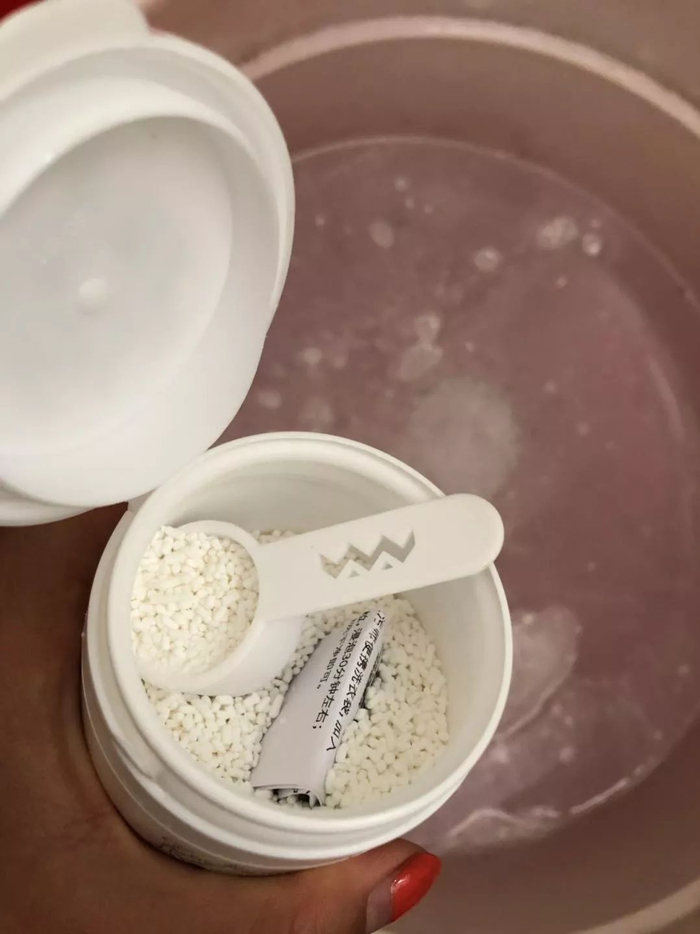 污师的开口是易撕条设计,轻拉就能打开,不用的时候直接盖上,盖子扣得很紧,完全不用担心里面的颗粒会受潮,5g的标准勺也能方便大家控制用量,用完勺子只需要倒插回去就好啦。