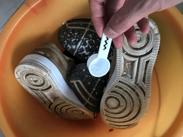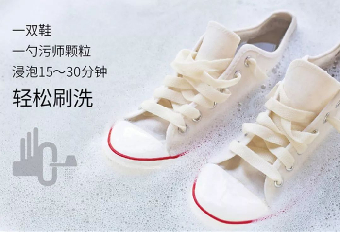 先接一盆温水,不需要很烫,然后放入一勺污师鞋袜洗涤颗粒,如果比较脏的话可以放1.5勺,用手将颗粒搅化开,接着把鞋子放入盆里,让水没过整个鞋面,浸泡30分钟+,再用刷子将鞋面的顽固污渍轻轻刷洗,不需要费很大力气,鞋子就能变得很干净啦,真的太方便了!
