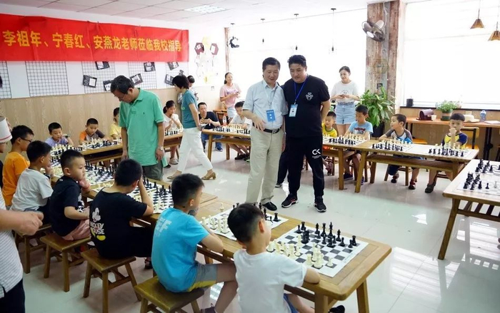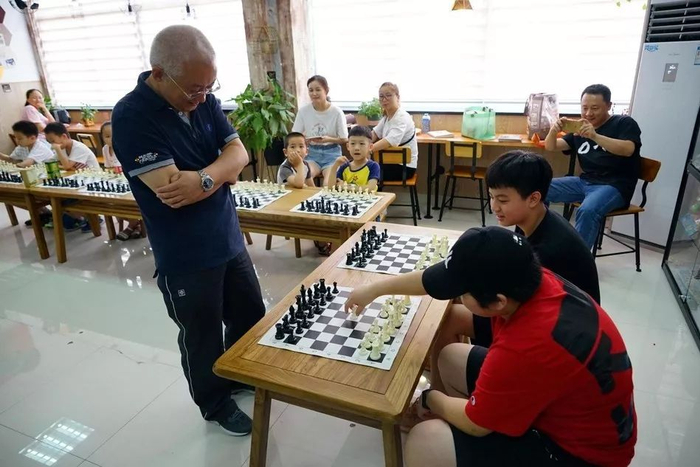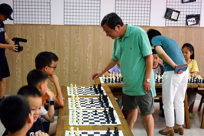 8月22日,众弈杯2019中国国际象棋甲级联赛白雪棋院专场第14轮比赛期间,国际象棋大师走进白雪棋院海宁分院与小棋手互动。