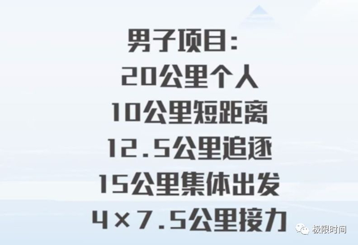 在个人赛中,男选手滑行20公里,4公里一圈;女选手滑行15公里,3公里一圈,共滑行5圈。