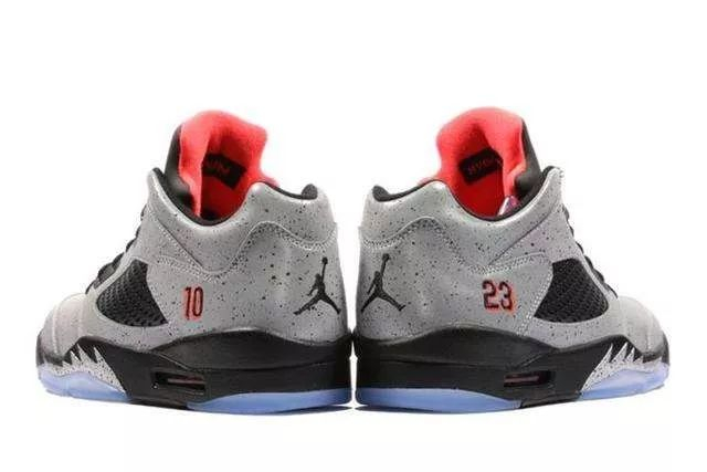 Jordan Brand为内马尔设计发售了特别版的AJ5。因为AJ5 Low是内马尔钟爱的篮球鞋,所以双方联名款以其为蓝本。在鞋的后方,有数字10和23的刺绣,这是内马尔的球衣号码和乔丹的球衣号码。而这双当年限量发售的AJ5 Low“Neymar”也是很多球迷争抢购买的产品。