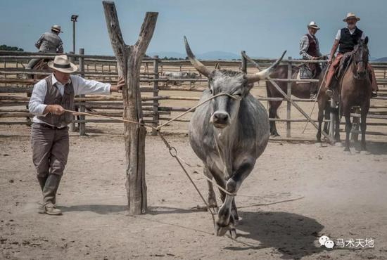 巴特里牛仔正在展示传统的套牛技巧 。