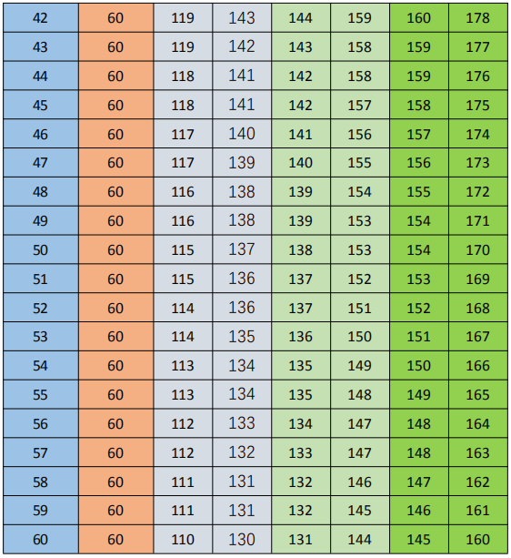 该表格使用规则:最大心率以220减去年龄计算,但最大心率存在个体差异,建议通过极限强度测试本人实际最大心率。