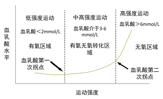第一拐点位于2 mmol/L左右,此时表明身体从有氧运动进入混氧运动;