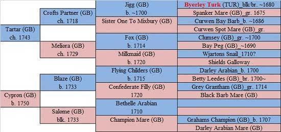 根据《纯血马族谱》(General Stud Book)记载,那时英国引进了100多匹中东地区的种公马(阿拉伯马、巴布马、土耳其马等)与英国当地雌马配种,配种所得的马驹被认作第一代纯血马。而当今世界所有的纯血马的血统,都可以追溯到其中三匹阿拉伯种公马上,这三匹马也因此被称为三大始祖(Three Foundation Sires)。