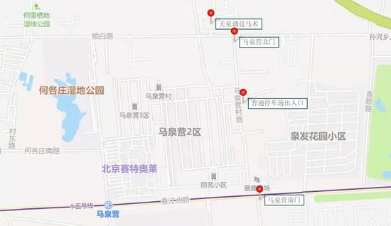 北京市崔各庄乡马泉营村南门至北门之间,北京六合天地置业有限责任公司对面(导航[六合天地置业]即可)(持CHF登记证及赛事门票即可入内停车!)