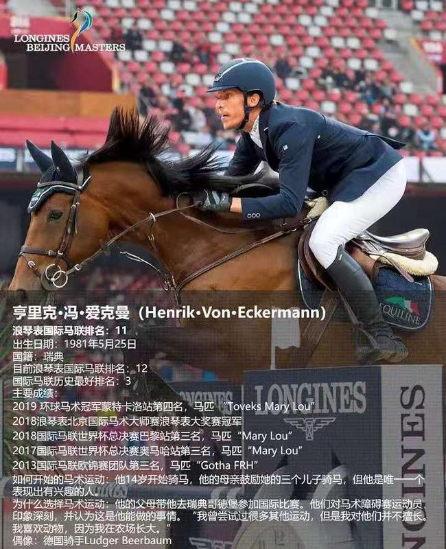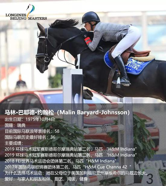 来自瑞典的女骑士马林·巴耶德·约翰松(Malin Baryard-Johnsson)目前浪琴表国际马联排名第58位,同时也是北京大师赛的好朋友。马林女士发自内心的热爱让她在马术赛场上展现出无限魅力。她从六岁开始骑马,从那时起,她就深深的爱上了这项运动。她很享受与马匹一起参加各种比赛的感受。身材高挑、面容姣好的马林·巴耶德·约翰松(Malin Baryard-Johnsson)曾经为瑞典的一家服装公司做模特,与瑞典跳高选手PederFredricson一同工作。她也曾出演过电影。“明明可以靠脸,但是她选择靠实力。”
