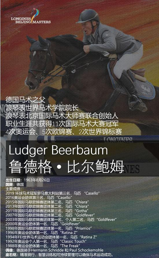 鲁德格•比尔鲍姆(Ludger Beerbaum)在德国雷森贝克运营着一家以自己名字命名的马房。2015年,他和Constantin Freiherr Heereman创建了雷森贝克国际马术中心。鲁德格可谓是中国骑手的老相识了,2011年多美马术携手鲁德格•比尔鲍姆(Ludger Beerbaum)创立北京国际马术大师赛,该赛事已成为国内标杆赛事。同时鲁德格是浪琴表世界马术学院的创始人之一。他是2004年雅典奥运会开幕式上的德国旗手。他的弟弟Markus和他的弟妹Meredith Michaels-Beerbaum代表德国参加障碍赛。