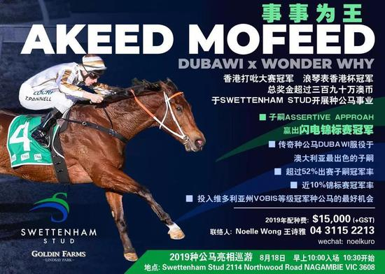 据第一赛马网了解,作为传奇种公马“迪拜威”服役于澳大利亚最出色的子嗣,“事事为王”目前已移师维多利亚州的天瑞牧场(Swettenham Stud) 并迎来2019年配种季,配种费被定为是15000澳元(不含税),而于未来澳大利亚一连串拍卖会,将会有更多“事事为王”子嗣出售。