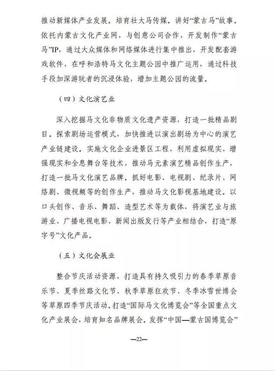 早在2017年内蒙古自治区人民政府发布《关于促进现代马产业发展的若干意见》,两年后内蒙古自治区党委宣传部刚刚又发布《内蒙古自治区马文化产业发展规划(2018-2022年)征求意见稿》,对原来的若干意见进一步升级,全面推动区内产业的快速发展,为全国立了一个标杆。