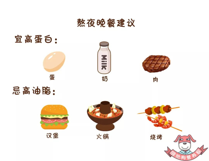 熬夜当天的晚餐不宜过饱,除了吃谷物、蔬菜水果等食物外,可选择吃些高蛋白、低脂肪的食物。进餐时间也可以比平常晚一些。