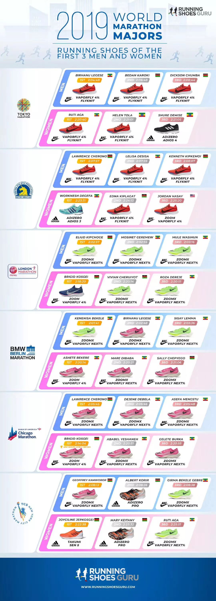 随着上周2019年纽约马拉松的落幕,今年的六大满贯赛事也已经结束。近日Running Shoes公布了2019年六大满贯比赛中,每一场比赛男、女前3名选手的参赛跑鞋。其中,NIKE跑鞋占了其中31双,占比约86%
