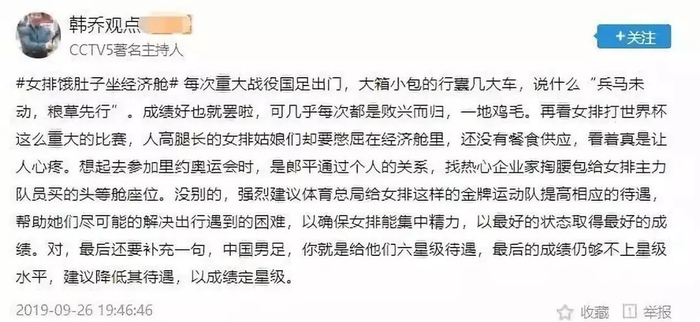 国庆70周年前夕,中国女排在日本成功卫冕世界杯冠军,从而为祖国献上一份分量十足的贺礼,但与此同时,女排队员们在转战最后一战前饿肚子坐经济舱一事则着实让国人非常感慨。网友在为女排抱不平的同时,还自发把女排饿肚子坐经济舱和国足坐包机出战这两个反差鲜明的现象进行了对比。这一话题随即在微博上引发广泛讨论,舆论纷纷呼吁体育主管部门应该想办法平衡一下,让中国女排这些为国家争光的国字号球队得到更多的尊重和回报,至于那些不能争光反而经常添堵的则需要对其待遇有所限制。