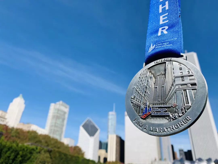 美国人热爱运动,比赛那一周,芝加哥处处烙上了马拉松印记。戴朝光拿着完赛奖牌去市中心的耐克旗舰店刻章,进到店里,气氛只能用“炽热”来形容,他感到是登上了领奖台,店员们把每位选手当英雄,上来拥抱击掌。街道上、地铁里、餐馆内,只要见到挂着奖牌的各国选手,就会有人为你翘起大拇指。