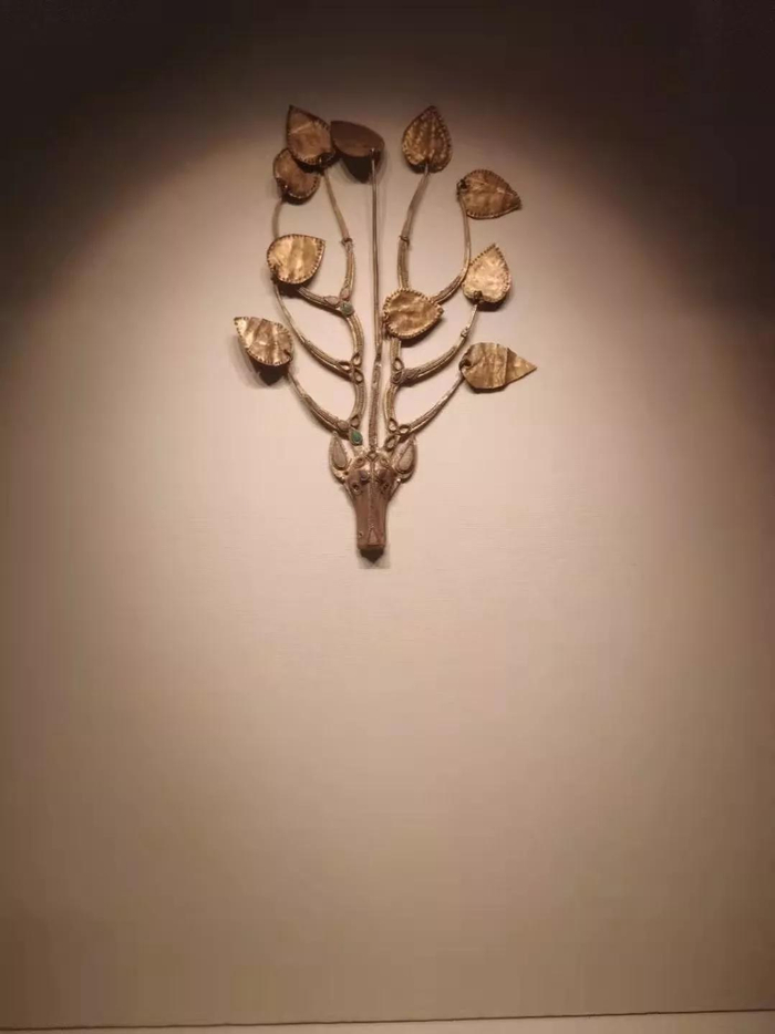 步摇是中国古代重要的头饰之一,多用金玉等材料制作,呈树枝形状,制作考究的则在树枝上缀有花鸟禽兽等装饰物。当佩戴者行走时,饰物随着步履的颤动而不停的摇曳,因此得名“步摇”。此步摇是北方游牧民族典型的装饰品,以草原上常见的牛、马、鹿等动物形象为主题纹饰。