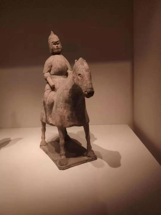 武士头戴盔、身披铠甲,战马全身披具装,这是南北朝时期甲骑具装俑的形象。甲骑具装是南北朝时期盛行的骑兵装备,标志着中国骑兵发展到重装骑兵阶段。鲜卑重装骑兵军队具有极强的冲击力,在建立北魏、统一北方、南北对峙的过程中发挥了积极作用。