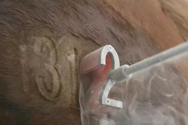 ④ 打完号之后,马匹烙号处的皮肤会有冻结现象,约2分钟左右全部解冻,在未解冻时,严禁按压。解冻后严禁磨蹭,并避免外物碰伤,待该部分被毛重新长出来后,号码效果显现。