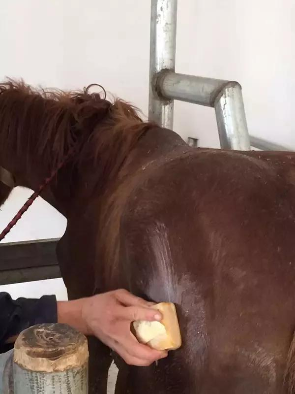 ① 将马匹烙号的部位剪毛。一般情况下,场号或特殊标记和出生年号打在马的左前肩稍下平整部位,场号在上,年号在下。个体编号则打在左后尻平整处。长毛剪掉后使用温水并涂抹肥皂,再使用刮刀彻底把被毛刮除干净,使皮肤裸露出来。之后必须涂上酒精作为冷却的介质,酒精度要求不低于95%,过低会影响打号的效果。