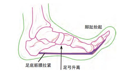 在跑步过程中,脚趾头特别是大脚趾也会背伸用力,在脚离地瞬间再助推一把。脚趾背屈时相当于在足底筋膜远端产生张力,坚硬的足底筋膜就会被动牵拉跟骨,产生“卷扬机效应”,使足弓抬高缩短。