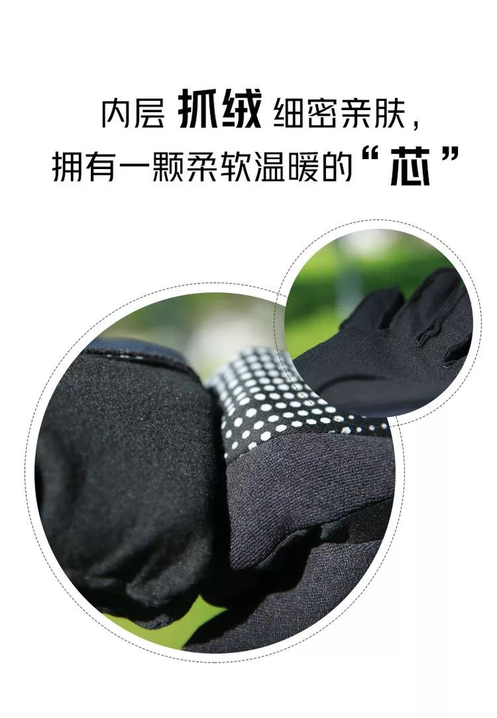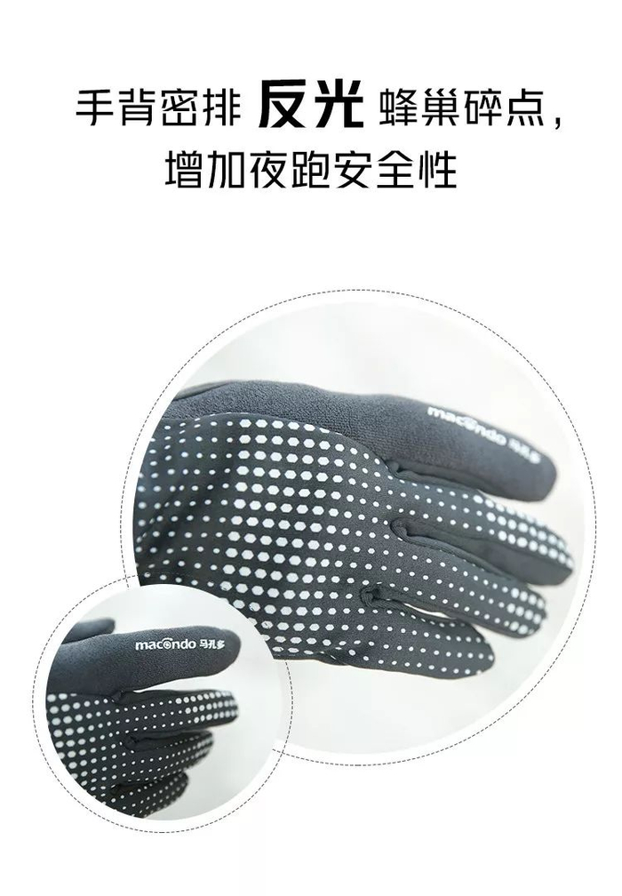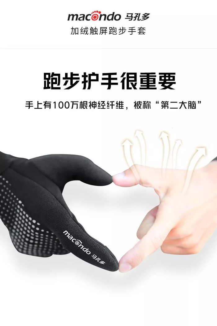 我推荐马孔多加绒触屏跑步手套,不同于普通的手套,专为冬季跑步人群设计。内层温暖抓绒,拇指食指可触屏操作手机,还有贴心的擦汗巾、防滑硅胶颗粒、蜂巢反光碎点等设计。