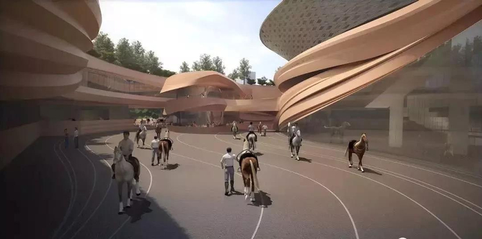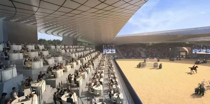 马术中心历经三次项目选址,最终落定于上海市浦东新区世博文化公园C04-01a地块,基地南临通耀路,西临济明路,总用地面积3.32公顷,并力争于2022年4月竣工验收。主体建筑包含1个90X60米的竞赛场地、热身场、训练场和高规格马厩等竞赛设施,以及约5000座观众与贵宾看台等一流观赛设施。中心内设隔离检疫、观赛、公共服务、媒体工作、组委会办公、服务配套及设备停车等功能区,致力于打造“五大中心”为一体的特色场馆。