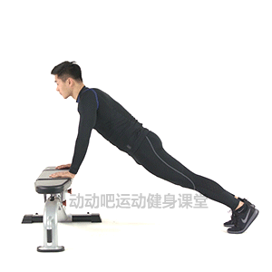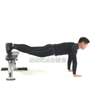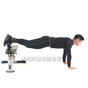 1.俯撑姿,双手支撑于地面,双脚脚尖置于椅凳上,手臂伸直,身体从头到脚呈一条直线;