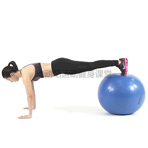1.俯撑姿,双手支撑于地面,双脚脚尖置于瑞士球上,手臂伸直,身体从头到脚呈一条直线;