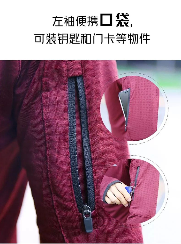 左袖便兜,可以放一些小物件,出门跑步钥匙门卡不用愁,还可装纸巾应急;